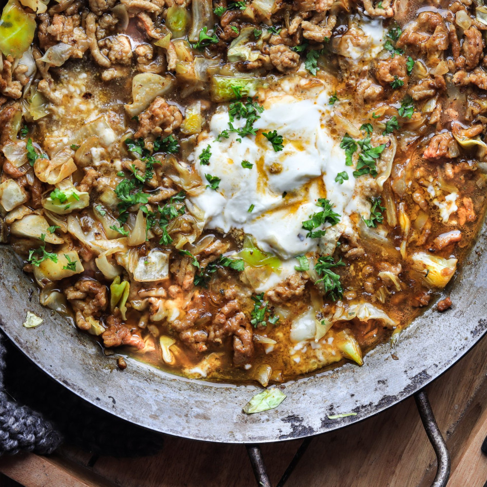 Der Spitzkohl ist super handlich. Viertelt ihn einfach und entfernt den Strunk. Anschliessend darf er gehackt werden. Erhitzt Öl in einer Pfanne und bratet die Zwiebel und das vegane Hack scharf an. Nach etwa 5 Min gebt ihr den Kohl hinzu und löscht mit Brühe ab. Mit etwas Salz, Pfeffer und dem geräucherten Paprikapulver abschmecken und das Ganze darf 10-15 Min köcheln. Als Topping verwende ich Soja Joghurt. In manch einem Bioladen findet man sogar vegane Sour Cream, die macht sich besonders gut. Aber entscheidet selbst!