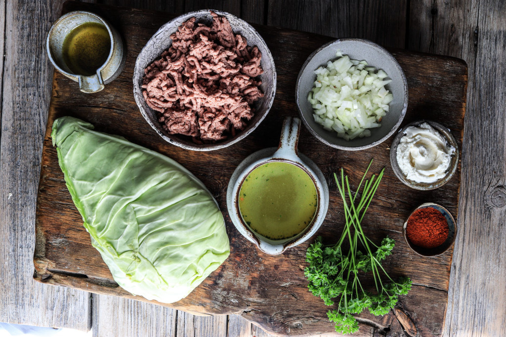 Öl in einer tiefen Pfanne erhitzen und die Zwiebel, Senf mit dem Hack 3 Min anbraten. Den Kohl hinzugeben und mit Gemüsebrühe ablöschen. Mit den Gewürzen abschmecken.