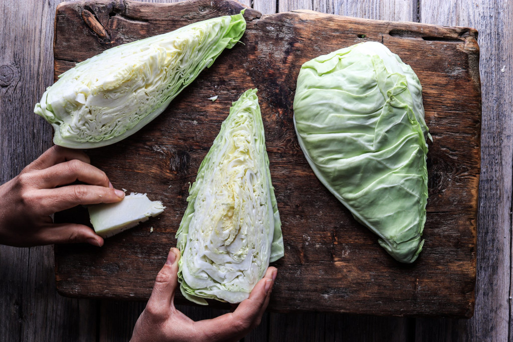 Spitzkohl waschen, halbieren, Strunk entfernen und Spitzkohl in mundgerechte Stücke schneiden.