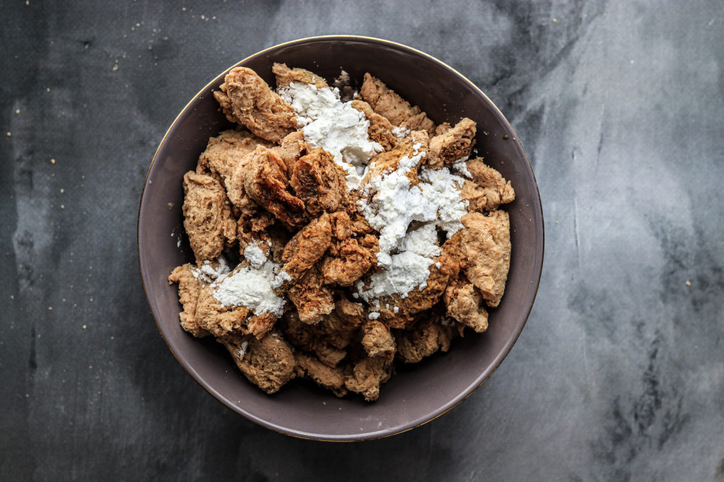 TVP wird übrigens fast immer eingeweicht, bevor es an die eigentliche Zubereitung geht. Das macht ihr entweder mit Wasser oder Brühe. Hat es sich komplett mit der Flüssigkeit vollgesogen, müsst ihr es ordentlich auspressen. Hier macht sich die gute, alte Faust ganz prima.