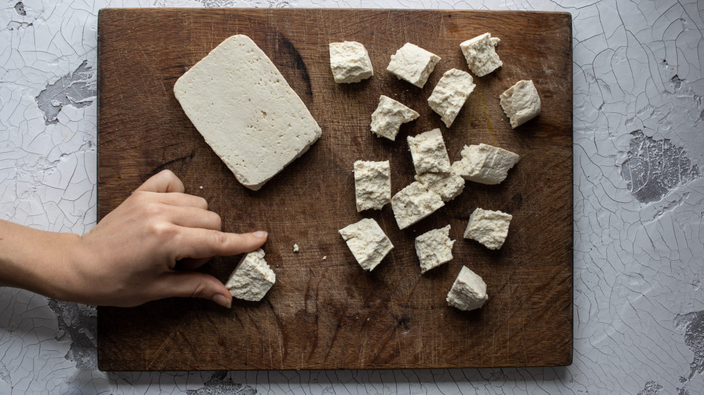 Halbiere den Tofu Block längs und trockne ihn in einem Handtuch. Zerfleddere ihn mit den Fingern in 2x2cm grosse Stücke.
