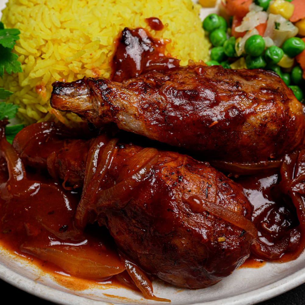 Für die Sauce erhitzt du 3 EL Olivenöl und brätst Zwiebel, Knoblauch, Kräuter, Agavendicksaft, Paprikapulver und Tomatenmark 5 Min scharf an. Bestreue alles mit Speisestärke und gieße die Flüssigkeiten hinzu. Köchle alles auf mittlerer Flamme 20 Min. Schmecke mit Salz und Pfeffer ab und gib die Sauce zu den Keulen