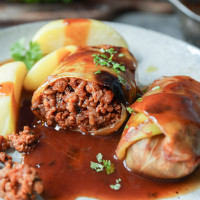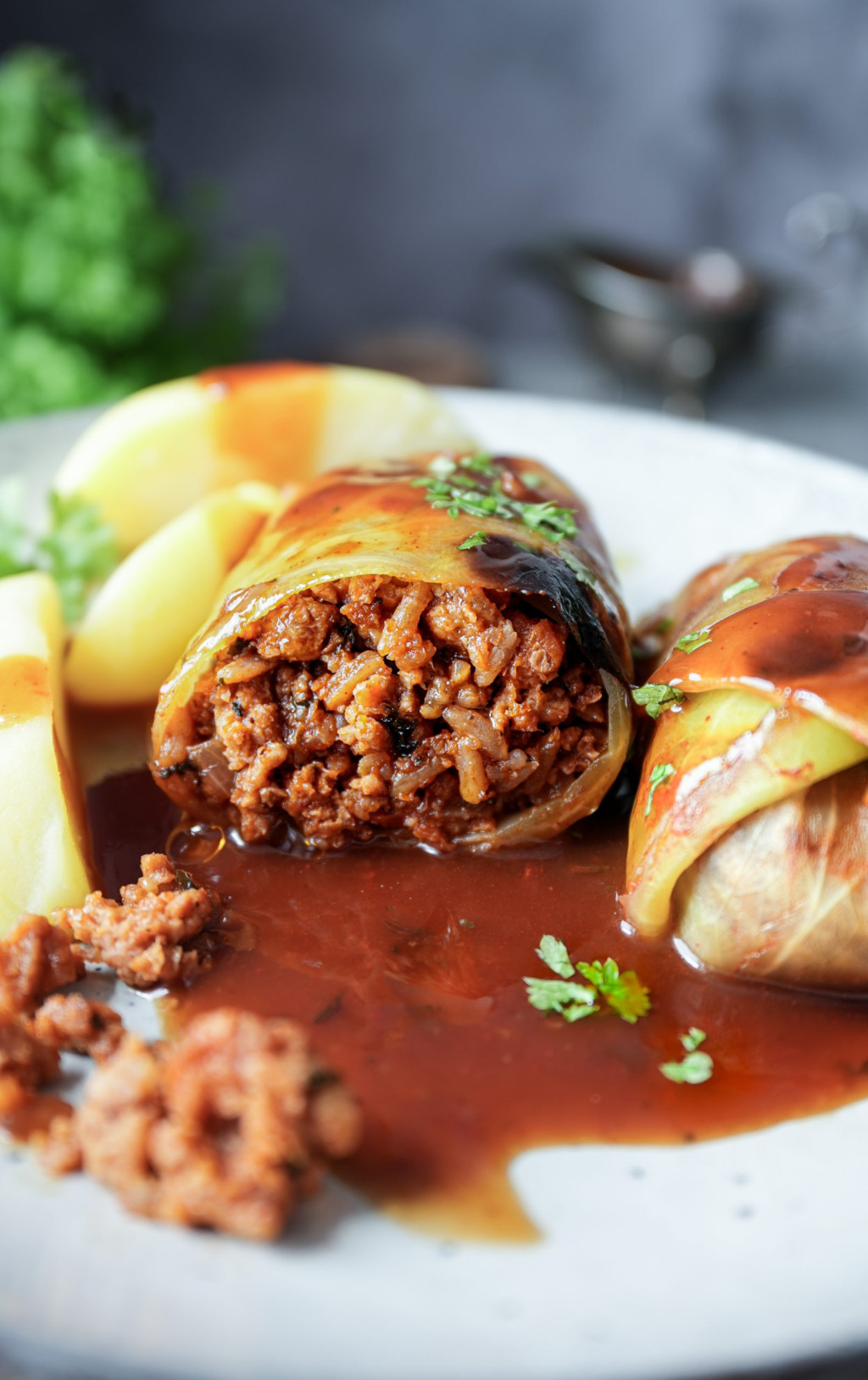 Auch unsere Sauce ist ne fixe Nummer. Hierfür verwerte man den Kohlsud, vermenge ihn mit Sojasauce und Brühpulver, etwas Gewürz und Lorbeer und backe alles mit den Kohlrouladen. That’s it. Die Zutaten im Detail findest du am Ende der Seite.