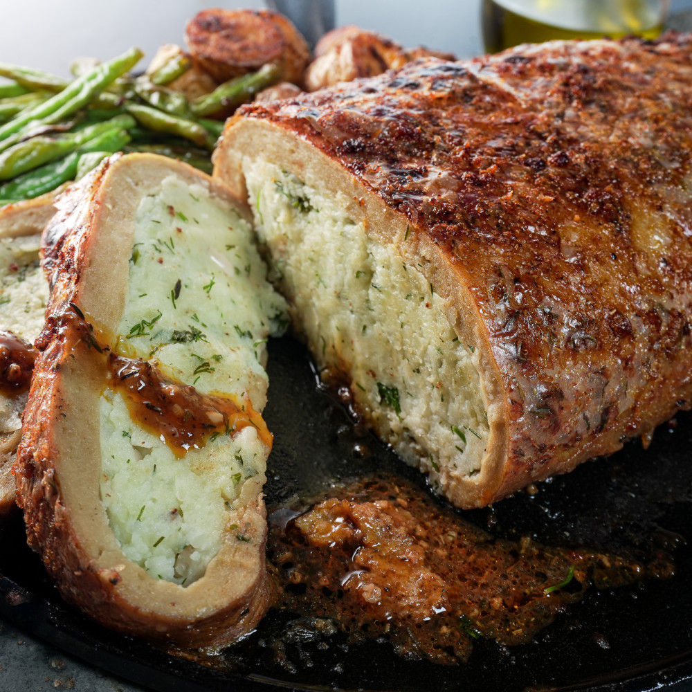 Rein pflanzlich kann richtig deftig sein. Und auch an Fleisch darf die Nummer erinnern. So bereiten wir diese Jahr zu Ostern einen Fleischersatz aus nahrahften Bohnen, proteinreichem Seitan und einer mega cremigen Füllung aus guten Bio Kartoffeln, Pinienkernen und frischen Kräutern zu.